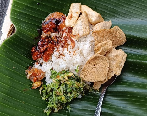 Murni menata nasi di piring anyaman bambu yang dilapisi daun pisang. Tangannya cekatan, tapi tak terburu-buru. Ada kehati-hatian dalam setiap geraknya, seolah setiap piring adalah bentuk penghormatan, bukan sekadar jualan.