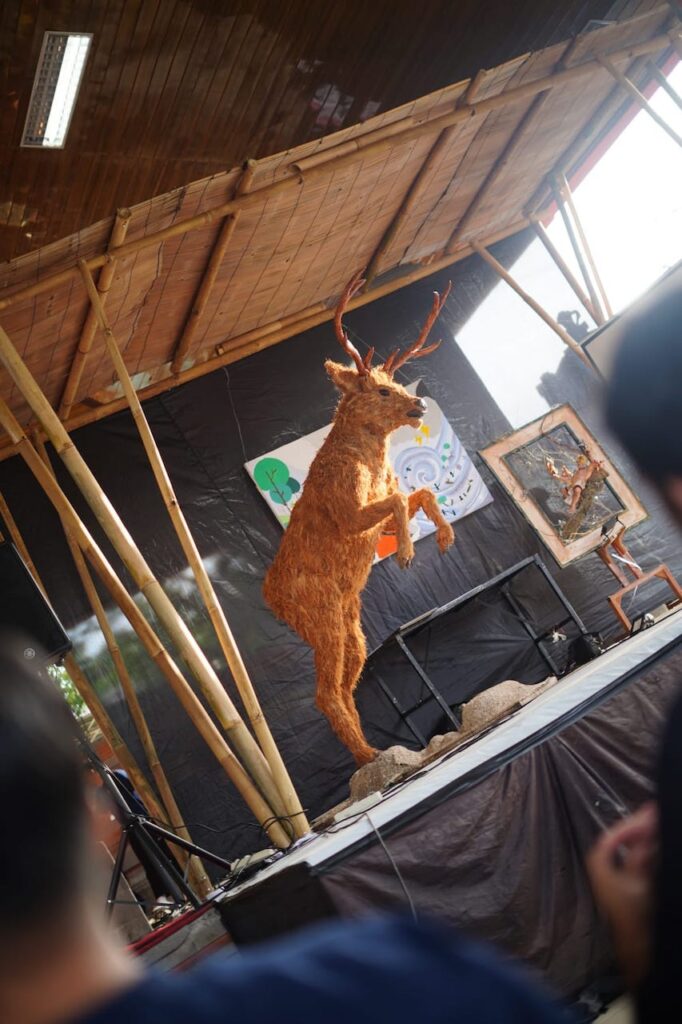Dari sebelah kanan (sisi barat) panggung Sasana Budaya digelar pameran karya seni rupa mahasiswa semester 3 yang memajang luaran mata kuliahnya berupa gambar nirmana, lukisan yang dipadukan dengan karya patung ogoh-ogoh. Dan, yang membuat saya “heran” dari mahasiswa ini adalah karya Patung Menjangan dengan dimensi yang cukup besar.