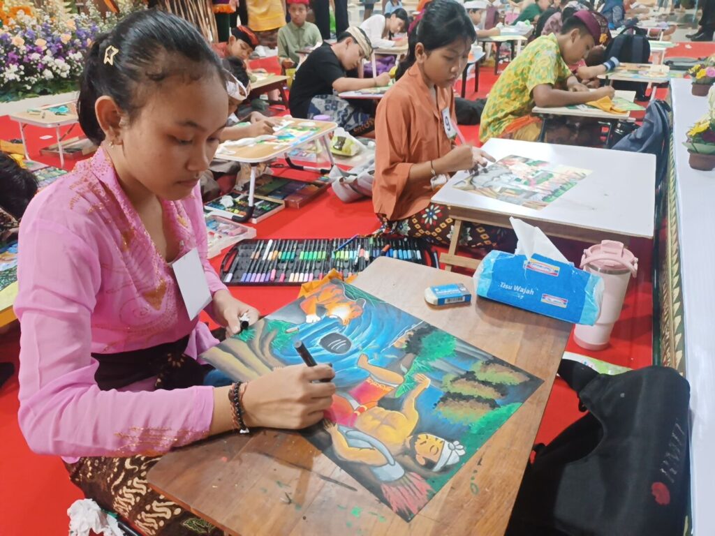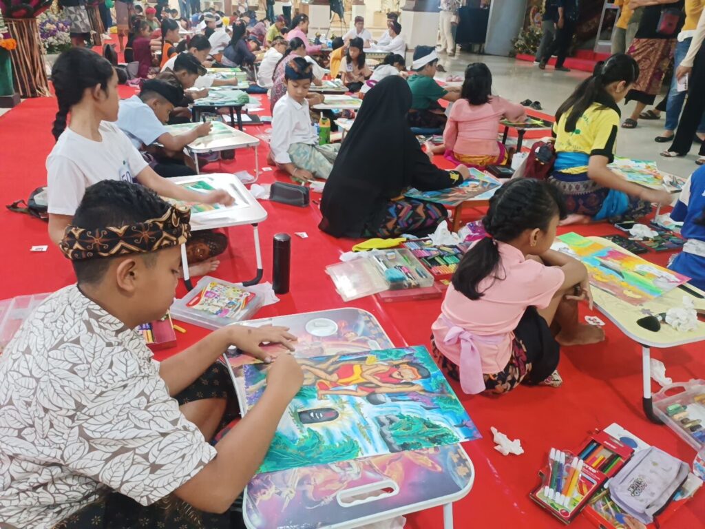 WIMBAKARA (lomba) menggambar Satua Bali serangkaian dengan Bulan Bahasa Bali VIII Tahun 2026 memikat pengunjung, Rabu (4/2/2026). Lomba yang melibatkan peserta anak-anak SD itu, tak hanya mampu menghasilkan karya seni lukis yang menarik, tetapi juga menunjukan kesiapan mengikuti lomba. Ketika aba-aba dimulai, mereka langsung menggambar tanpa tolah-toleh lagi. Pagi itu, lantai 1 Gedung Ksirarnawa, Taman Budaya Bali, terasa meriah dan penuh kreativitas.
