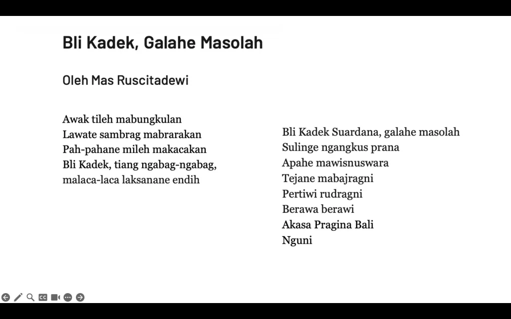 Jika diringkaskan, kiranya sajak ini menegaskan bahwa pentas hanya bisa dilakukan kalau segalanya sudah pantas, seperti teladan dari para pragina (penari, seniman) Bali dahulu. Yang jadi hanya yang nadi; atau yang nadi hanya yang jadi. Taksu tak pernah kesusu.