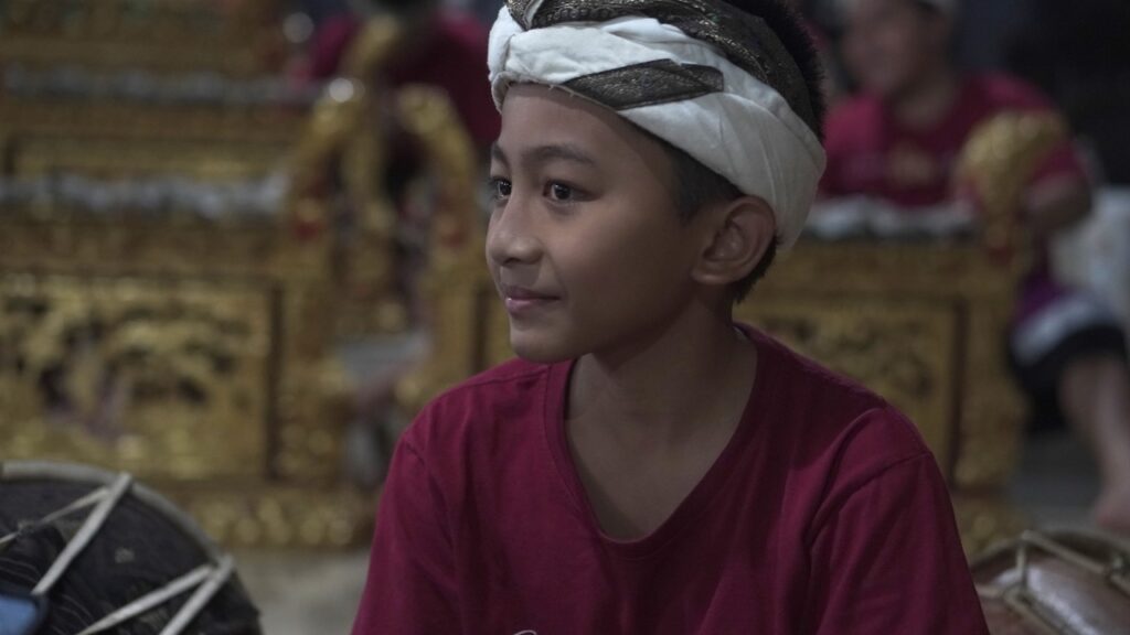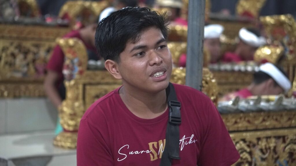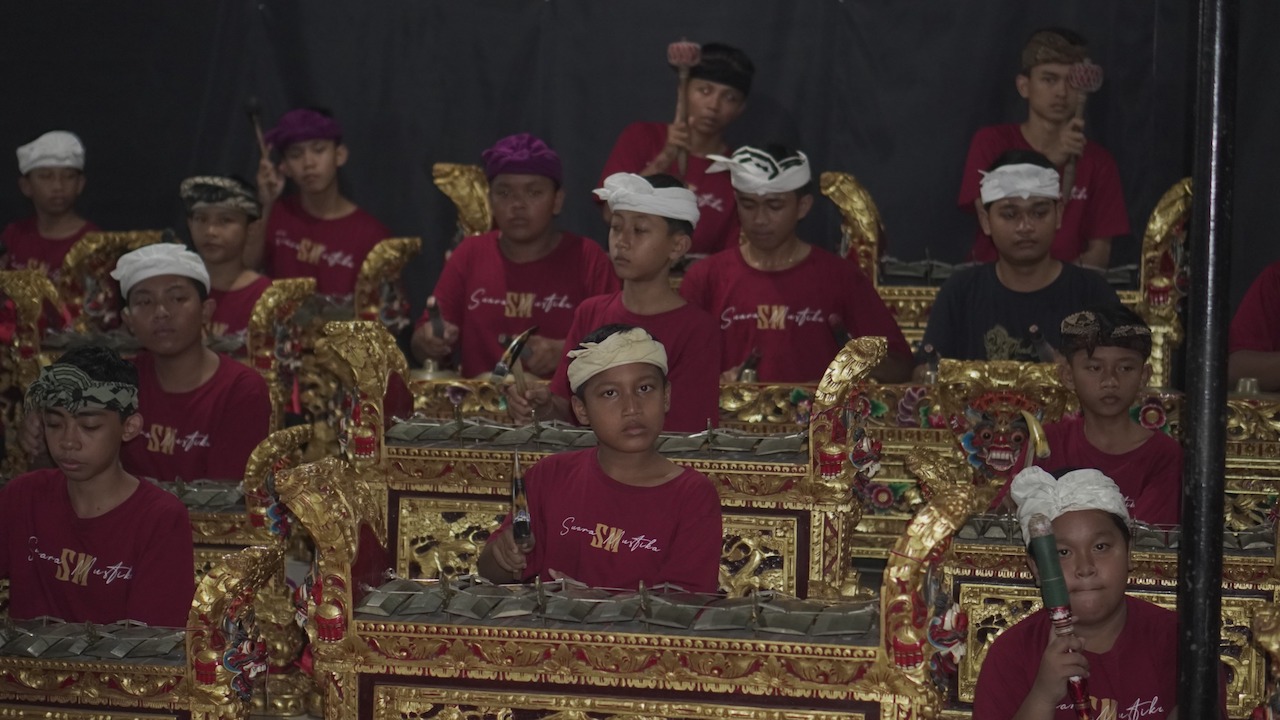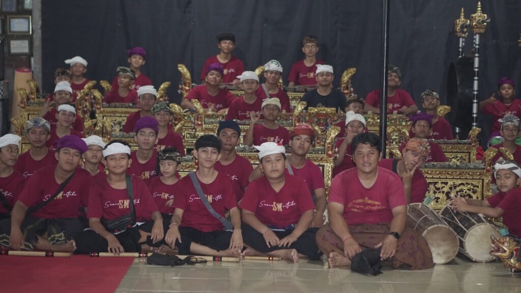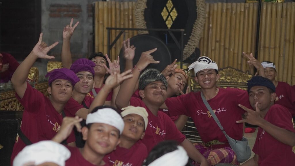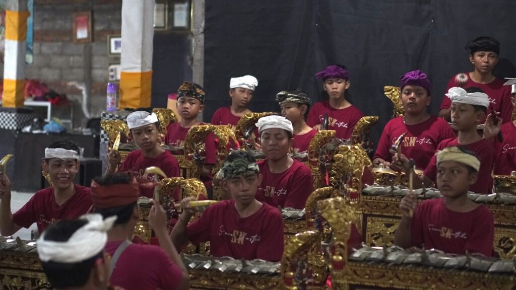 Tiba, dan masuklah kami ke sebuah tempat yang cukup lapang. Di sebuah bangunan saya dapat melihat puluhan pemuda berbaju kaos merah dengan saput dan udeng, mengerahkan seluruh tenaga untuk menabuh gamelan. Mereka tentu sedang latihan. Gerakan mereka cekatan. Mata berfokus pada bilah-bilah gamelan. Gong besar dipukul mengikuti irama. Sementara tangan-tangan dengan lugas menabuh kendang, yang seluruh paduan itu memperdengarkan ritme dan harmoni yang memanjakan telinga.