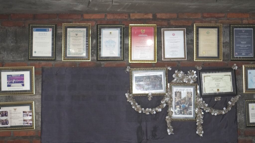 “Tang (saya)awalnya tidak kepikiran mendirikan sanggar. Ini sebenarnya adalah keterpanggilan hati saya. Sehingga saya meminta gamelan kakek saya untuk saya rawat di sini (di sanggar),” kata Okta sembari menunjukkan peninggalan gamelan gong pacek peninggalan kakeknya yang terpajang di panggung sanggarnya.