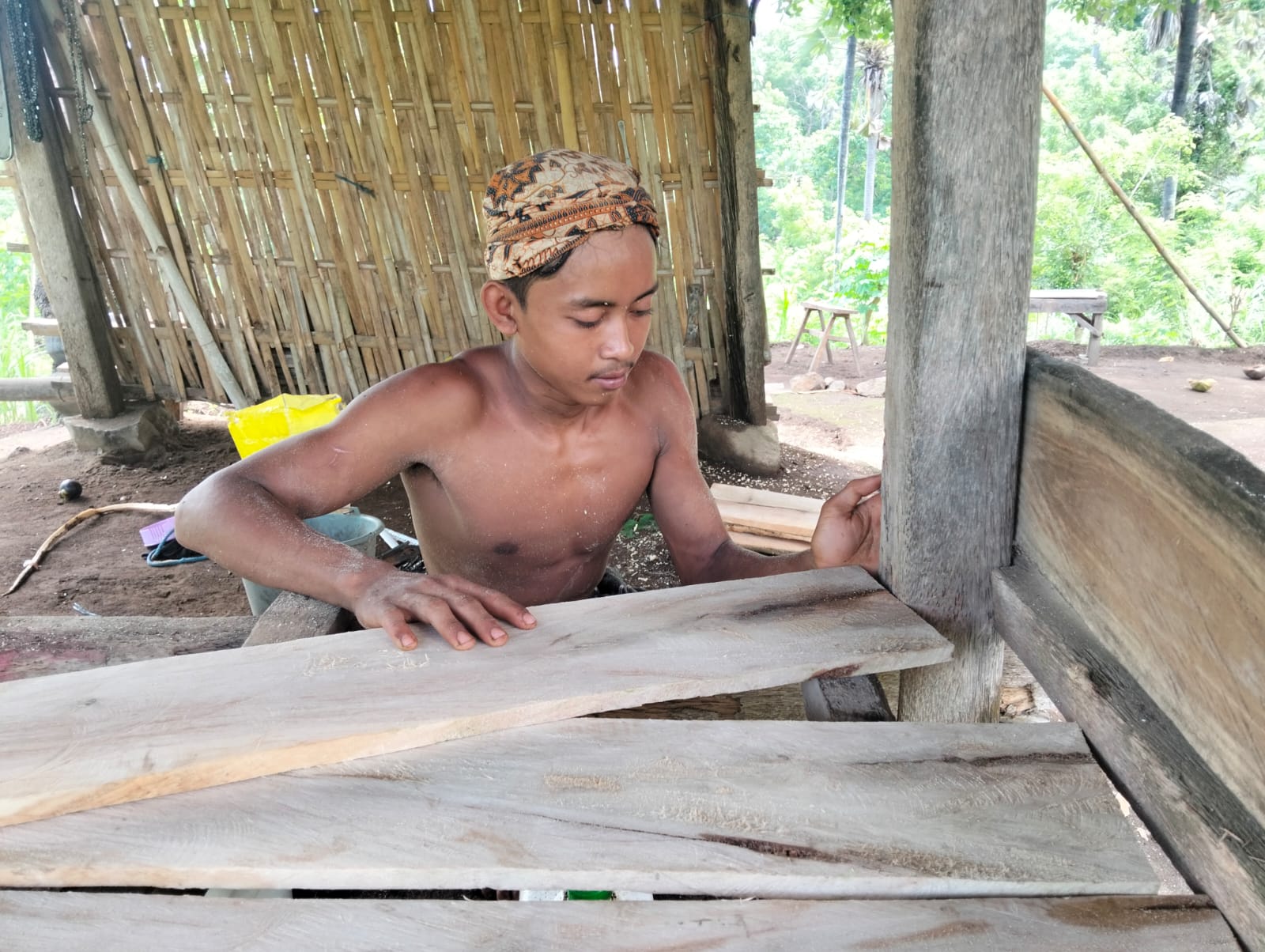 Serpihan kayu keluar dari liang kecil gergaji, secara acak jatuh ke lantai. Selesai memotong, lelaki itu membakar sebatang rokok, lalu rokok diisap dan asap terbang ke atap pondok. Atap itu dibuat dari daun-daun pohon ental atau siwalan (borassus flabellifer) yang tumbuh menjulang di sekitar rumahnya.