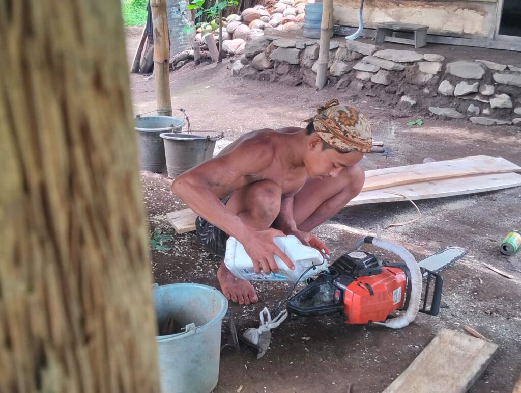 Memotong kayu adalah kegiatan waktu senggang, ketika ia tak bisa melakukan proses pembuatan gula. Musim hujan membuatnya ia istirahat, atau mengerjakan sesuatu yang bisa dikerjakan.