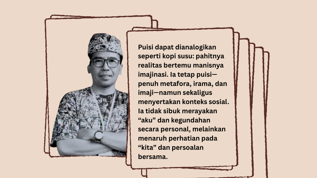 Puisi dapat dianalogikan seperti kopi susu: pahitnya realitas bertemu manisnya imajinasi. Ia tetap puisi—penuh metafora, irama, dan imaji—namun sekaligus menyertakan konteks sosial. Ia tidak sibuk merayakan “aku” dan kegundahan secara personal, melainkan menaruh perhatian pada “kita” dan persoalan bersama.