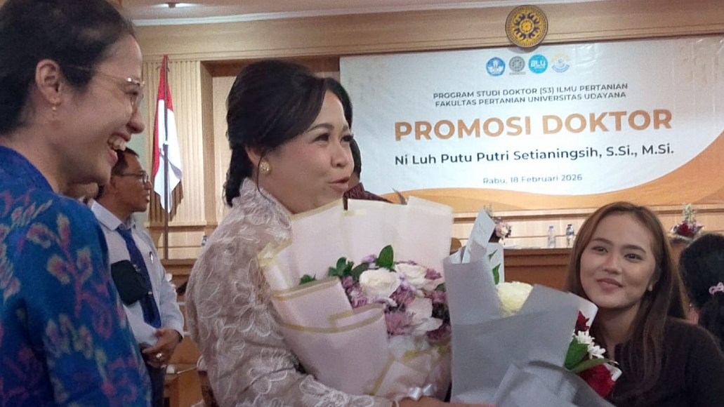 Ni Luh Putu Putri Setianingsih dalam Ujian Terbuka Program Studi Doktor Ilmu Pertanian di Universitas Udayana, Denpasar, Rabu 18 Februari 2026, mempresentasikan risetnya tentang strategi teknologi dalam menjaga stabilitas senyawa bioaktif kulit jeruk siam Kintamani