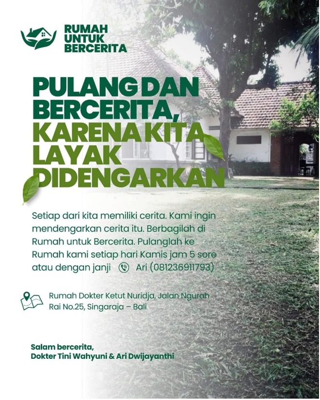 Bersama Dokter Tini Wahyuni, Ni Made Ari Dwijayanti menerjemahkan konsep itu ke dalam praktik yang sangat konkret: Rumah untuk Bercerita. Sebuah ruang yang tidak menuntut siapa pun untuk tampil sebagai ahli, tidak memaksa narasi menjadi spektakuler, dan tidak mengejar sensasi dan validasi sehingga demi privasi para yang pulang untuk bercerita (bukan curhat) datanya dirahasikan. Di rumah itu, yang utama adalah kehadiran—dan kesediaan untuk mendengar (untuk saat ini dilakoni oleh Dokter Tini Wahyuni dan Ni Made Ari Dwijayanti berdua).