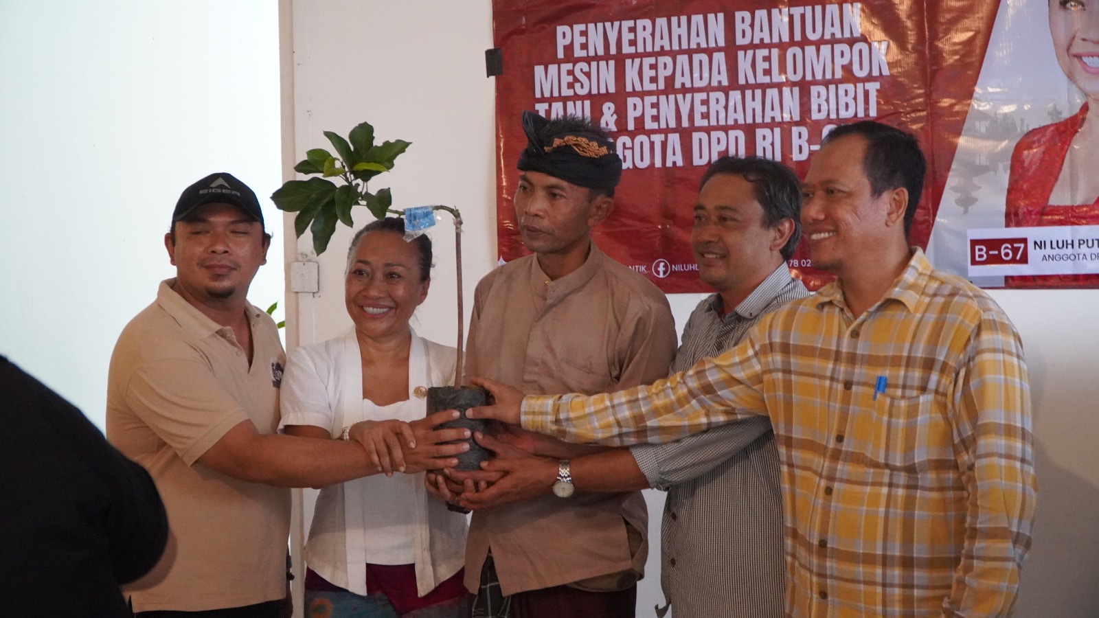 RUMAH kecil bernomor 76 di pinggir Jalan Sudirman, Singaraja, tepatnya di Kelurahan Banyuasri, Kabupaten Buleleng, Bali, siang itu mendadak ramai. Orang-orang berdatangan dengan atribut beragam. Sebagian mengenakan pakaian adat Bali lengkap dengan udeng dan selendang. Sebagian lain tampil santai dengan kaos dan celana panjang. Di dalam ruang tengah, beberapa orang berkemeja biru sigap menata kursi plastik dan membentangkan banner bertuliskan “Penyerahan Bantuan Mesin kepada Kelompok Tani & Penyerahan Bibit Anggota DPD RI B-67.”