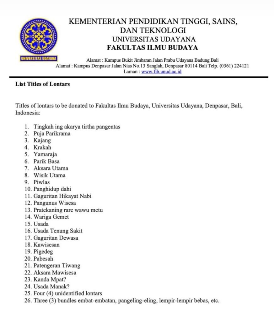 Di tengah inisiatif repatriasi artefak atau warisan budaya Indonesia dari Belanda, ada usaha personal seorang peneliti Bali yang tinggal di Belanda menyumbangkan koleksi lontarnya ke Perpustakaan Lontar Fakultas Ilmu Budaya (FIB) Universitas Udayana, Senin pagi, 23 Februari 2026.