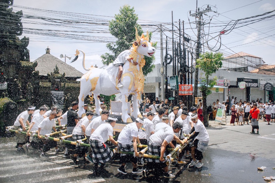 Apalagi ada properti berupa arak-arakan lembu putih dan bade padma—tempat layon berbentuk bangunan beratap dihiasi ukiran-ukiran khas. Panggungnya berupa jalan raya, penontonnya berdiri di pingggir jalan, dan jalanan dipenuhi dengan masyarakat yang mengiringi upacara.