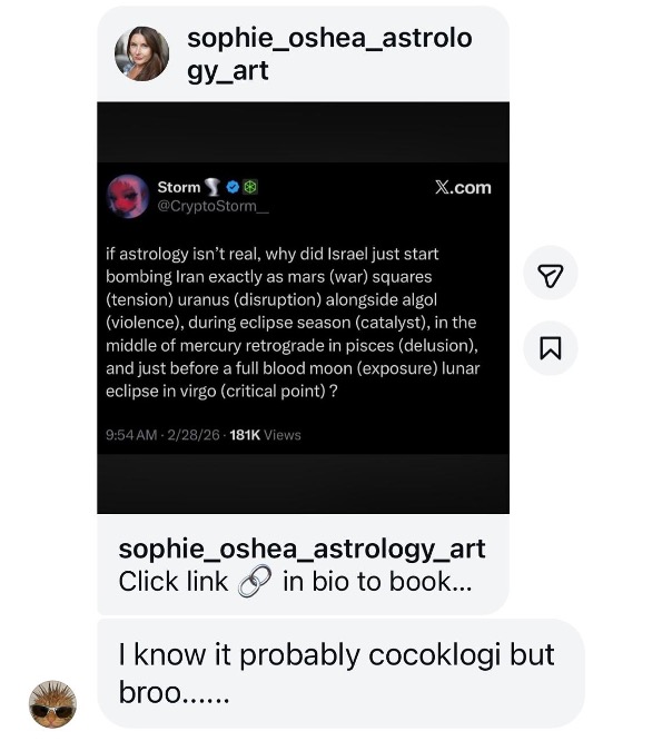 Beberapa hari sebelumnya, seorang teman lain mengirim tangkapan layar lewat direct message Instagram. Isinya adalah sebuah tweet dari akun astrologi di platform X yang mencoba mengaitkan konflik Israel dan Iran dengan posisi planet-planet.