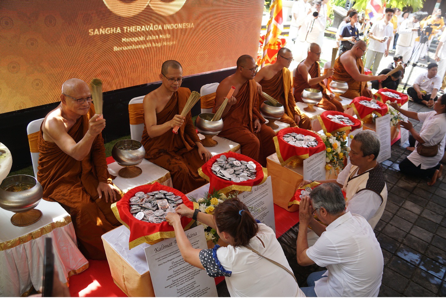 Prosesi dimulai dengan doa-doa yang dipimpin 50 bhikkhu dari Saṅgha Theravāda Indonesia. Para umat yang hadir sebagian besar mengenakan pakaian putih, berlutut khidmat di hadapan para bhikkhu. Di meja-meja kecil berlapis kain merah, tampak logam-logam donasi umat yang akan dilebur.