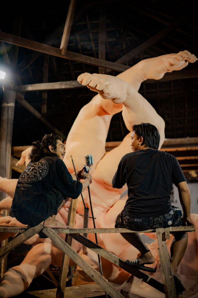 “Wujud fisik ogoh-ogoh ini berbentuk sungsang dengan posisi kepala di bawah dan kedua kakinya di atas. Tokoh korban digambarkan sebagai penyandang disabilitas, sementara pelaku direpresentasikan sebagai figus superior,” pungkasnya ketika dihubungi melalui pesan Whatsapp.