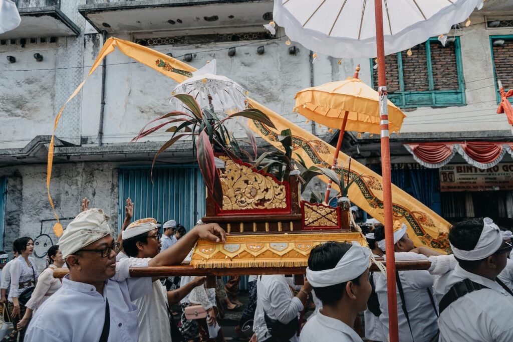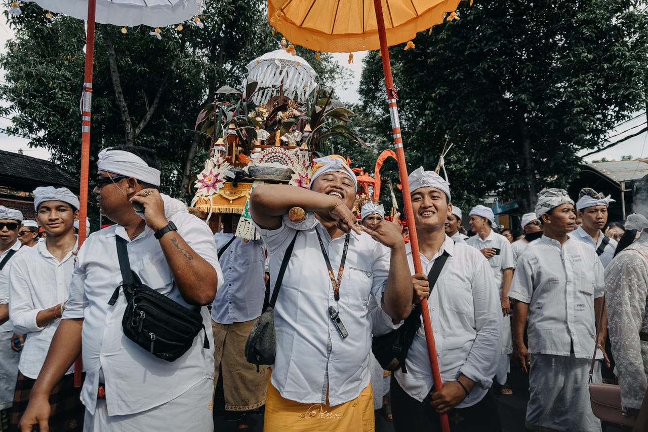 Di sebelah saya, Bli Gede Putra, seorang pemuda yang bahunya tampak memerah karena memikul pratima (benda suci), sesekali menyeka keringat dengan ujung udengnya. Meski peluh mengucur deras, tak ada guratan kesal di wajahnya.