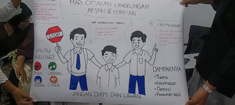 Salah satu daya tarik utama kegiatan ini adalah pendekatan interaktif. Peserta tidak hanya menerima materi tentang konsep dan strategi penangan bullying di sekolah, tetapi juga terlibat dalam role play penanganan kasus, menyusun kesepakatan kelas, hingga merancang kampanye anti-bullying melalui poster dan flyer.